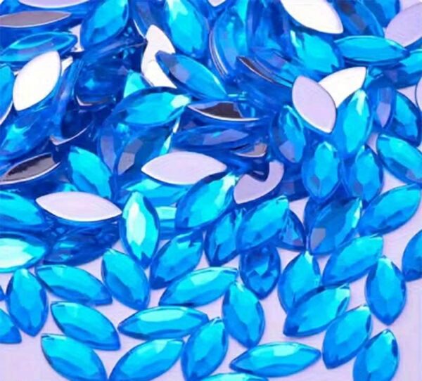 200 db 0.7 cm X 1.5 cm lapos hátú, akril, lószem formájú strasszkövek. 3,3 Ft/db.