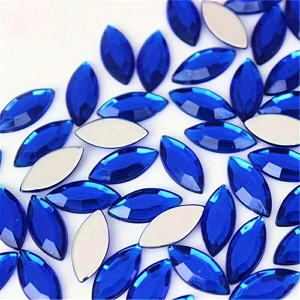 200 db 0.7 cm X 1.5 cm lapos hátú, akril, lószem formájú strasszkövek. 3,3 Ft/db.
