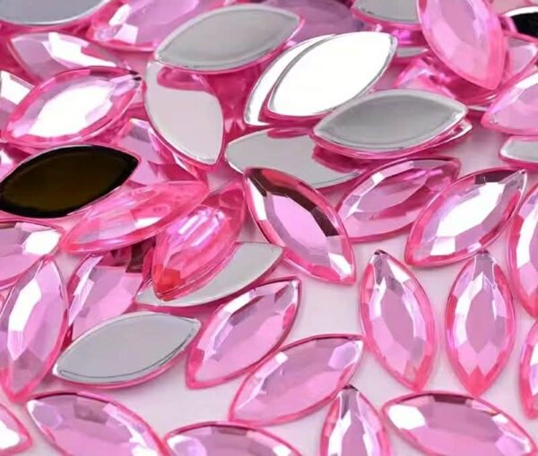 200 db 0.7 cm X 1.5 cm lapos hátú, akril, lószem formájú strasszkövek. 3,3 Ft/db.