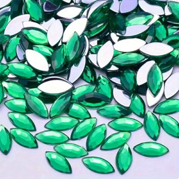 200 db 0.7 cm X 1.5 cm lapos hátú, akril, lószem formájú strasszkövek. 3,3 Ft/db.